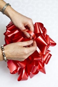 If you don’t want to make your pompoms from scratch you can by some “pull bows” from your local florist. By pulling the ribbon you can make the bows ruche up and then tie four together to create your pompom.
