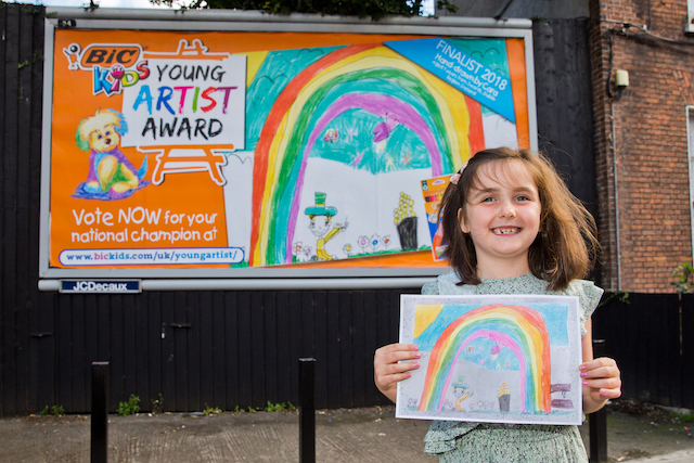 Cara aged 7 from Swords, Dublin, regional winner for Ireland of the BIC KIDS Young Artist Award with her artwork and one of the billboards on which it is displayed.