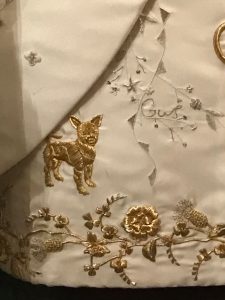 Queen Camilla’s beautiful dress was made specially for her and if you look carefully near her feet, you will see her two dogs embroidered in gold thread, and the names of all her near family.