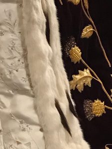 The white fur comes from sewing together the skins of many stoats. They are brown in summer and white in winter with black tails, so they blend in with the snow. The tails make the black flecks. So you have to kill the stoats in winter to get enough pelts to make the cape.  In winter they are called ermine, and it’s what kings and queens wear to make them look royal. In the past, no one else was allowed to wear it. By the way, did you know, no one is allowed to eat swan meat in the United Kingdom except the King and Queen, even today?