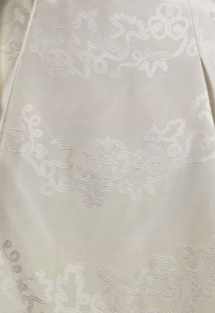 Details of the garland motif containing the White Rose of York that was woven into the jacquard fabric of HRH Princess Eugenie’s wedding dress created by Peter Pilotto and Christopher De Vos. Credit: Royal Collection Trust / (c) All Rights Reserved