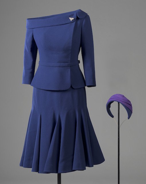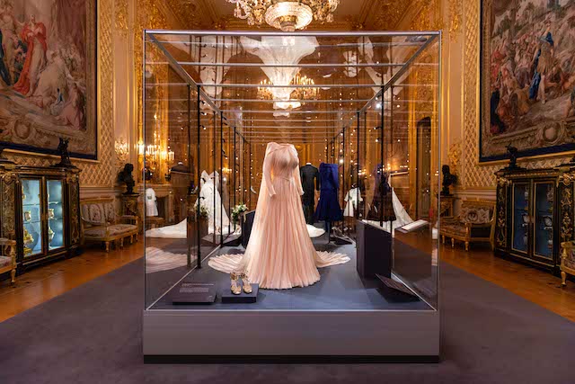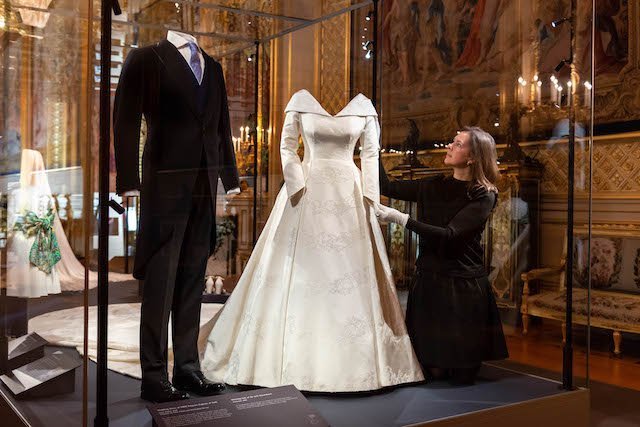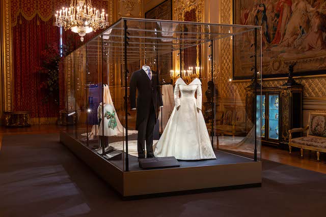 The display also includes the maid-of-honour outfit of HRH Princess Beatrice of York. She wore a blue dress with an asymmetrical neckline by the London-based couture house Ralph & Russo, and a blue and purple headpiece by British milliner Sarah Cant.