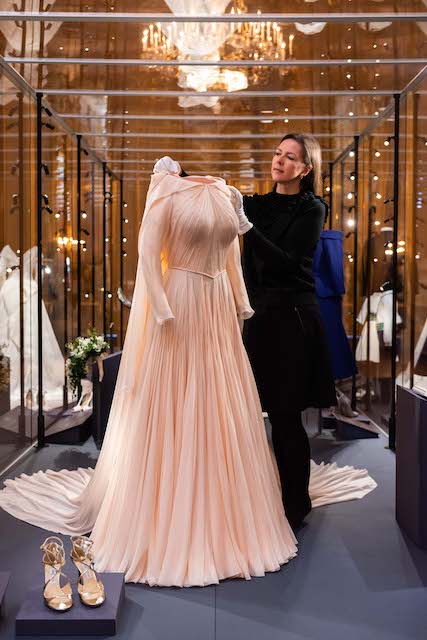 Curator Caroline de Guitaut makes final adjustments to the evening gown. Credit: Royal Collection Trust / (c) All Rights Reserved