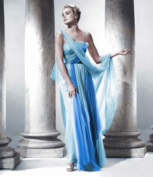 Grace Kelly was in a vintage blue chiffon gown in Alfred Hitchcock’s movie To Catch a Thief. Grace Kelly blue dress was a floor length a-line evening prom gown, with spaghetti straps and draped detailing at the shoulder. The two-toned chiffon color looked great on her.