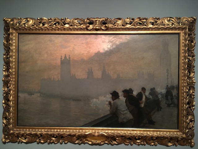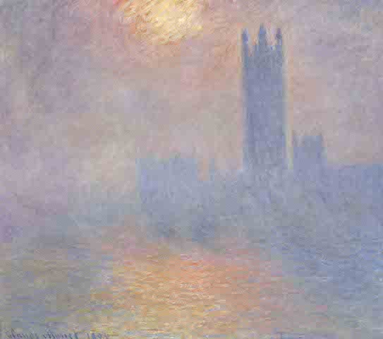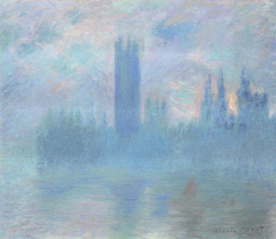 Fog was central in the paintings of many exiled French artists interested in the newly built monuments. The association between the fog and the Houses of Parliament / Westminster is the main theme of Monet’s study showing the Houses of Parliament under different lighting.