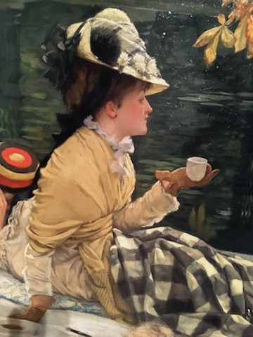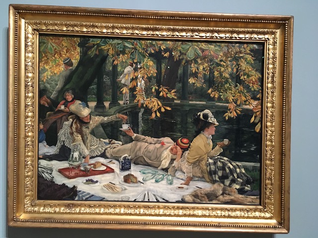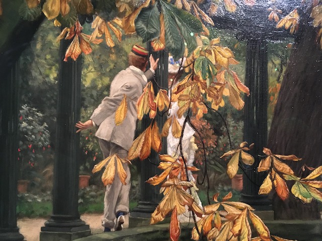I love Tissot’s portrayal of flirtatious couples in their fabulous outfits. This oil paint on canvas is called Holyday by James Tissot (c.1876) set in his own garden in St John’s Wood.