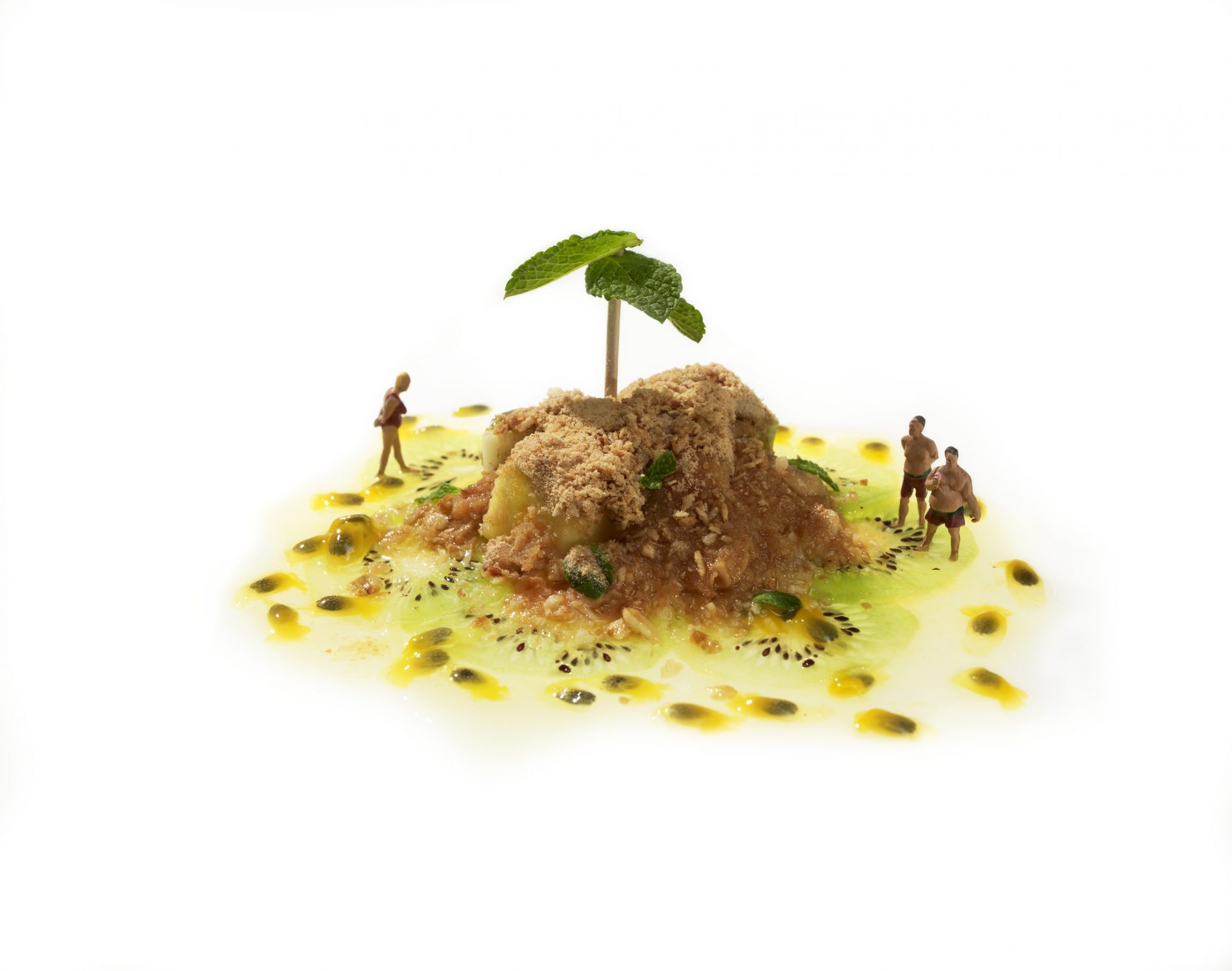 5. Pile the syrup fruit on the plate. Finely slice the rest of the kiwi and lay around the edge of the pile. Spoon over a generous helping of sand. Drizzle the syrup mixture around the island.