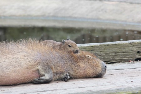 Capybara Zena relaxes after giving birth to triplets at Chessington World of Adventures Resort in Surrey.