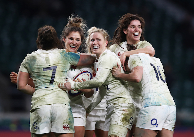 Amy Wilson Hardy (2nd L) of England is congratulated by teammates after scoring a try during the Women’s Six Nations match between England and France at Twickenham Stadium on February 4, 2017 in London, England. (Photo by David Rogers – RFU/The RFU Collection via Getty Images)