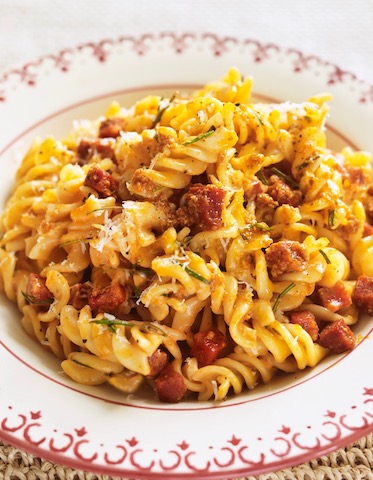 FUSILLI WITH TOMATO PESTO, CHORIZO AND ROSEMARY