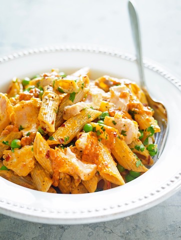 PENNE WITH SALMON, PEAS AND CHILLI PESTO