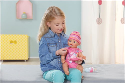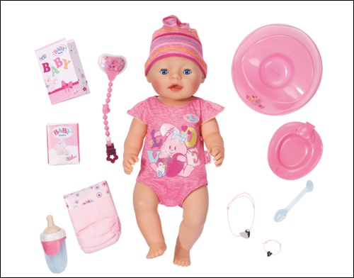 Cute and clever BABY born Interactive Doll has nine lifelike functions and eleven accessories – including a brand new dummy chain! BABY born cries real tears, opens and closes its eyes, eats and drinks and even controlled wets and poops!