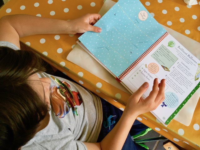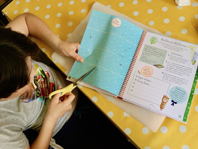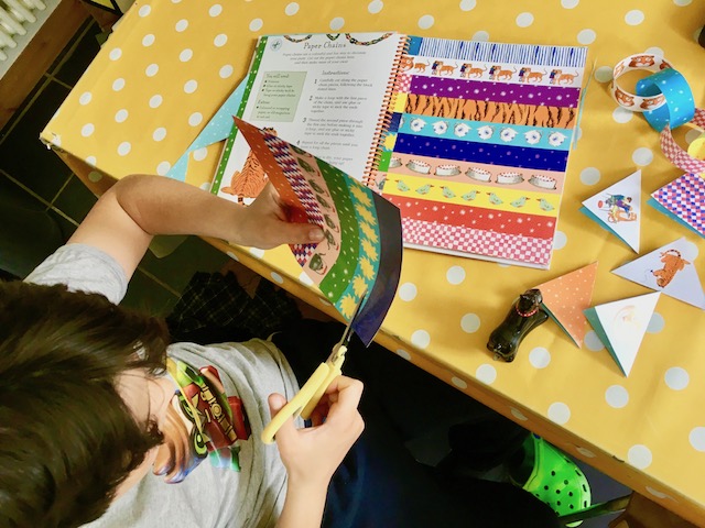 Diego has made some bunting and colourful paper chains which he hanged in his room ready for his birthday party. He was busy for a while which gave me a bit of a breather… (giggle). Perfect activity book!