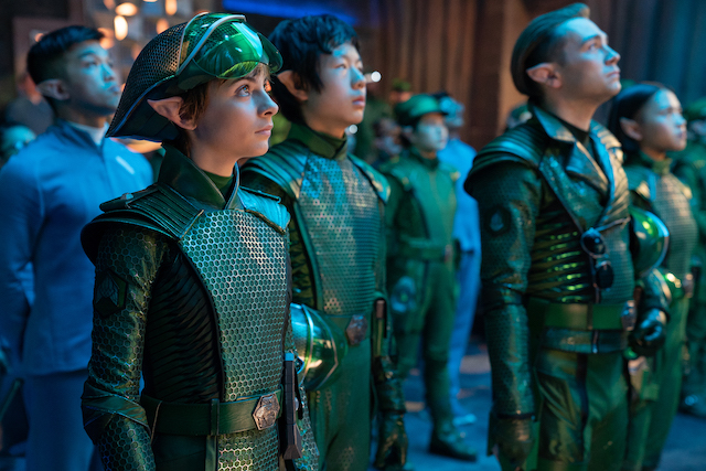 Nonso Anozie is Butler, Lara McDonnell is Holly Short, Josh Gad is Mulch Diggums and Ferdia Shaw is Artemis Fowl in Disney’s ARTEMIS FOWL, directed by Kenneth Branagh. Photo by Nicola Dove. © 2020 Disney Enterprises, Inc. All Rights Reserved.