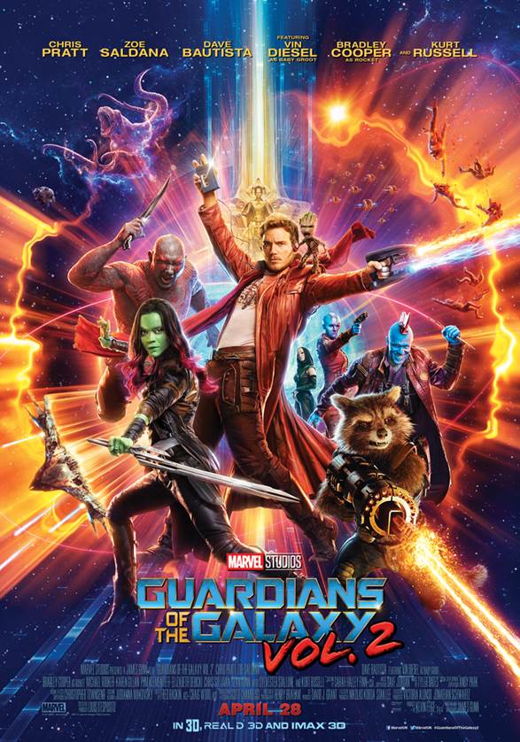 Marvel’s Guardians of the Galaxy Vol. 2 is written and directed by James Gunn and stars Chris Pratt, Zoe Saldana, Dave Bautista, featuring Vin Diesel as Baby Groot, Bradley Cooper as Rocket, Michael Rooker (Yondu), Karen Gillan, Pom Klementieff, Elizabeth Debicki, Chris Sullivan, Sean Gunn, Tommy Flanagan, Laura Haddock, with Sylvester Stallone, and Kurt Russell. Kevin Feige is producing, and Louis D’Esposito, Victoria Alonso, Jonathan Schwartz, Nikolas Korda and Stan Lee are the executive producers.
