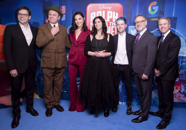 LONDON, ENGLAND – NOVEMBER 25: Director Phil Johnston, Gal Gadot, John C Reilly, Sarah Silverman, Dan TDM, director Rich Moore and producer Clark Spencer attend the UK Premiere of Disney’s ‘Ralph Breaks The Internet’ at the Curzon Mayfair on November 25, 2018 in London, United Kingdom. (Photo by StillMoving.net for Disney)