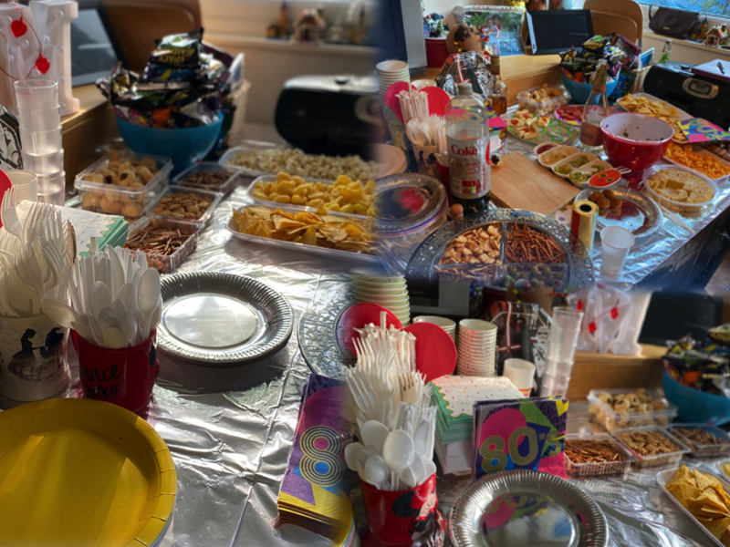 I created a section for themed selfies or group photos with an 80s themed banner attached to a room divider. I also put costumes and props in a box so guests could use them for their pictures.