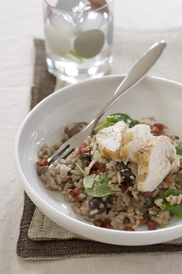 Stir a knob of butter into the risotto, season well, and add the chicken and spinach leaves. Divide between 2 warm bowls, scatter over the Parmesan and pancetta and serve.