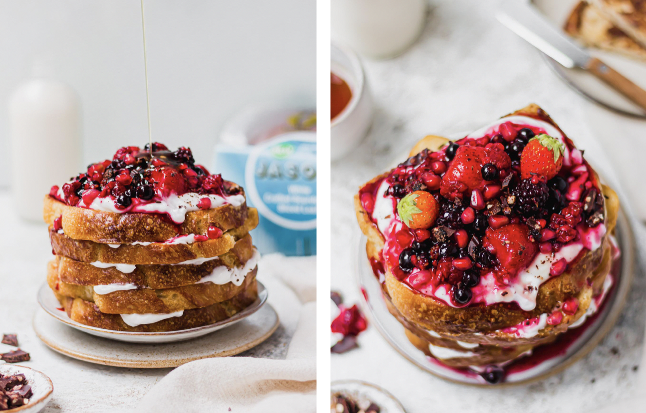 - Serve the French toast stacked, topped with some coconut yoghurt, the warmed berries, extra syrup, pomegranate and chopped chocolate.