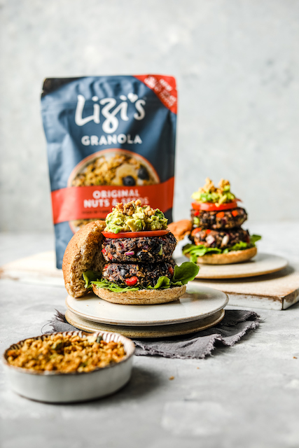 - Once cooked, stack in the burger buns with lettuce, sliced tomato, mashed avocado and some extra granola for added crunch. Enjoy!