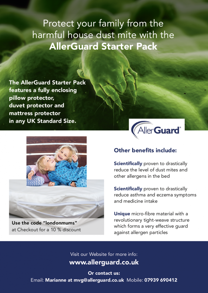 Allerguard Starter Pack – it features a fully enclosing pillow protector, duvet protector and mattress protector in any UK standard size. Use the code ‘londonmums‘ at checkout for a 10% discount