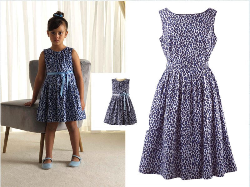Fashion designer Rachel Riley has created an exclusive leopard print for one of her classic sleeveless dresses that mum and daughter can wear together at a special event like a wedding or a Summer Party or even a Christmas dinner. The dress has pleats at neckline and skirt in an original fun leopard print with tones of blue. The blue ribbon sash at waist is for the little girl’s dress. The ladies’ design comes with a matching belt in self fabric. Both dresses are fully lined with an invisible side zip. These design has a Fifties’ look and feel which I love. It reminds me of my favourite TV series of all time, Mad Men.