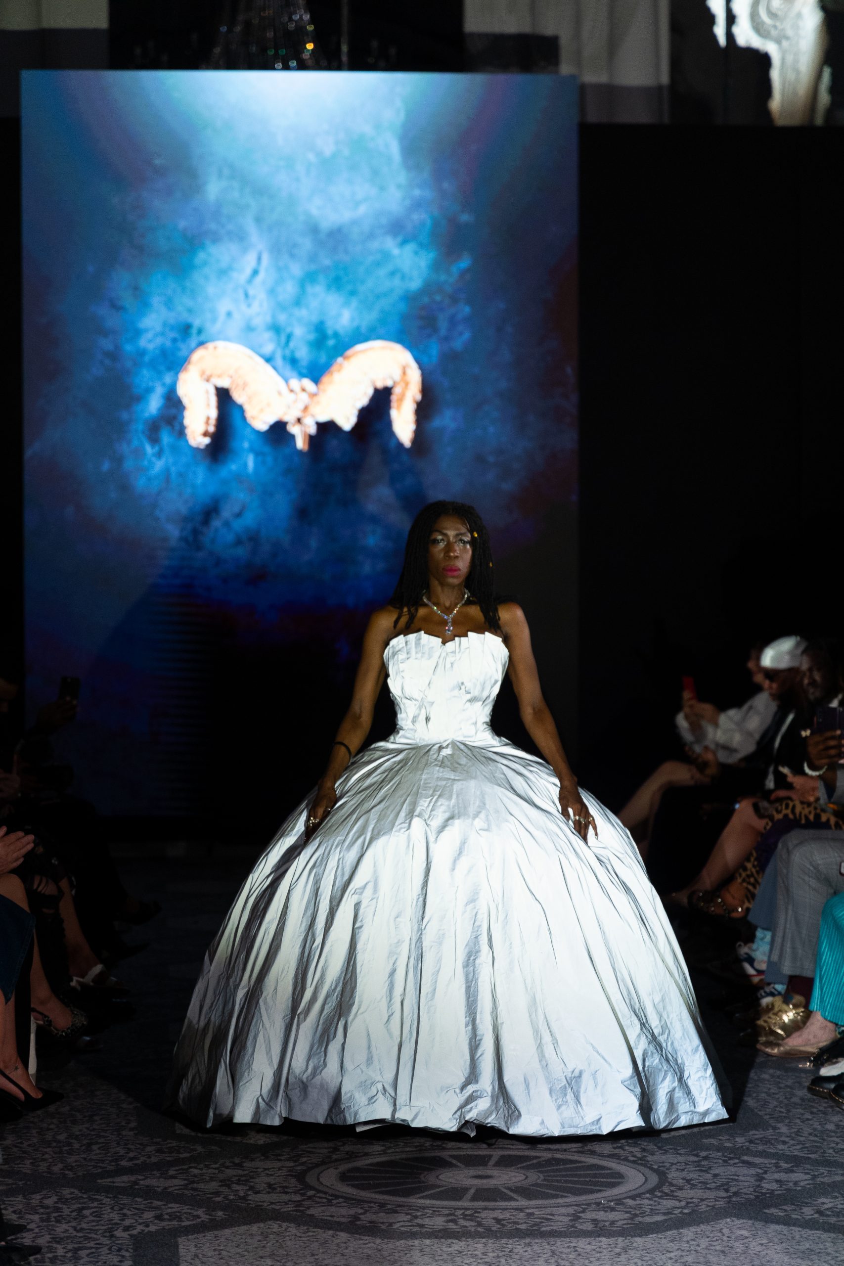 ‘Wherever you go, shine’. So goes Malan Breton’s motto, and he definitely walks the walk. Diamanté on black, glittering trains, glossy PVC in black and red, brushed silver, shimmery silks…