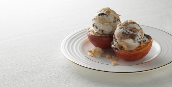 SERVE with a scoop of Carte D’Or Amaretto and Vanilla Ice Cream inside each peach half.