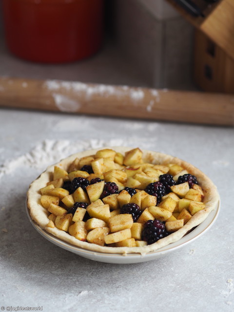 Trim the edges of the pastry, prick all over with a fork and blind bake for 7 minutes. Whilst that’s cooking peel and chop your apples into small cubes. Add to a bowl with the blackberries, clementine, sugar and spices. Mix well.