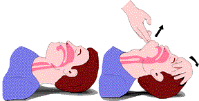 Airway – Open the Airway (2 fingers under their chin and one on their forehead and tilt the head and lift the chin to take the tongue off the back of the throat)