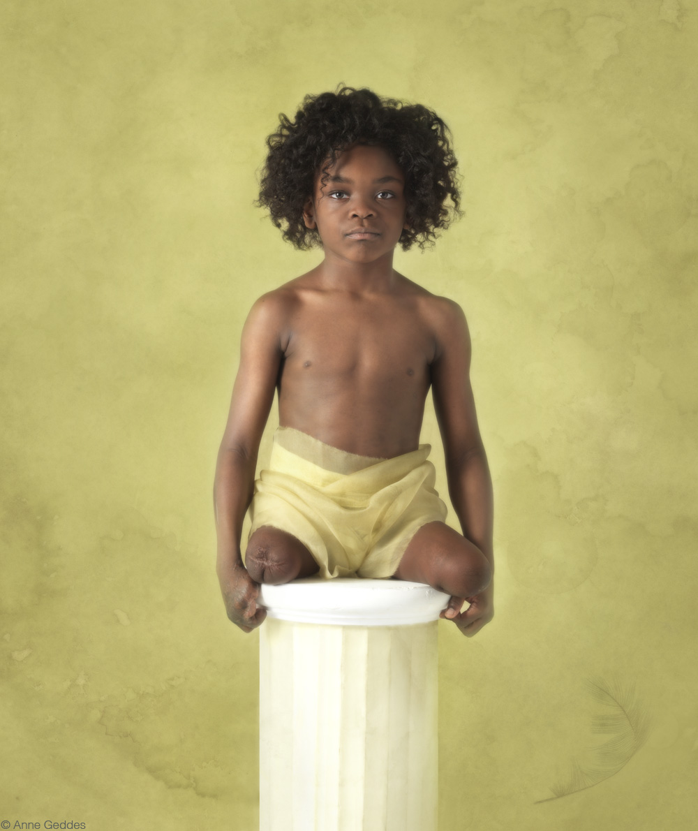Amber, five, from Croxteth, Liverpool, is the youngest child to be photographed by Anne Geddes. Amber lost her legs and arms after contracting the disease aged two. She is pictured with her sister Jade.