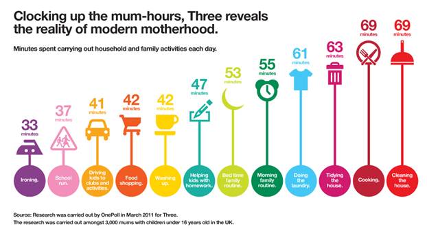Clocking up the mum-hours, Three reveals the reality of modern motherhood. Mums work over 70 hours a week on family activities. Mums would earn £37,000 a year if paid for their time. Cleaning the house takes up the biggest share of mums’ time.