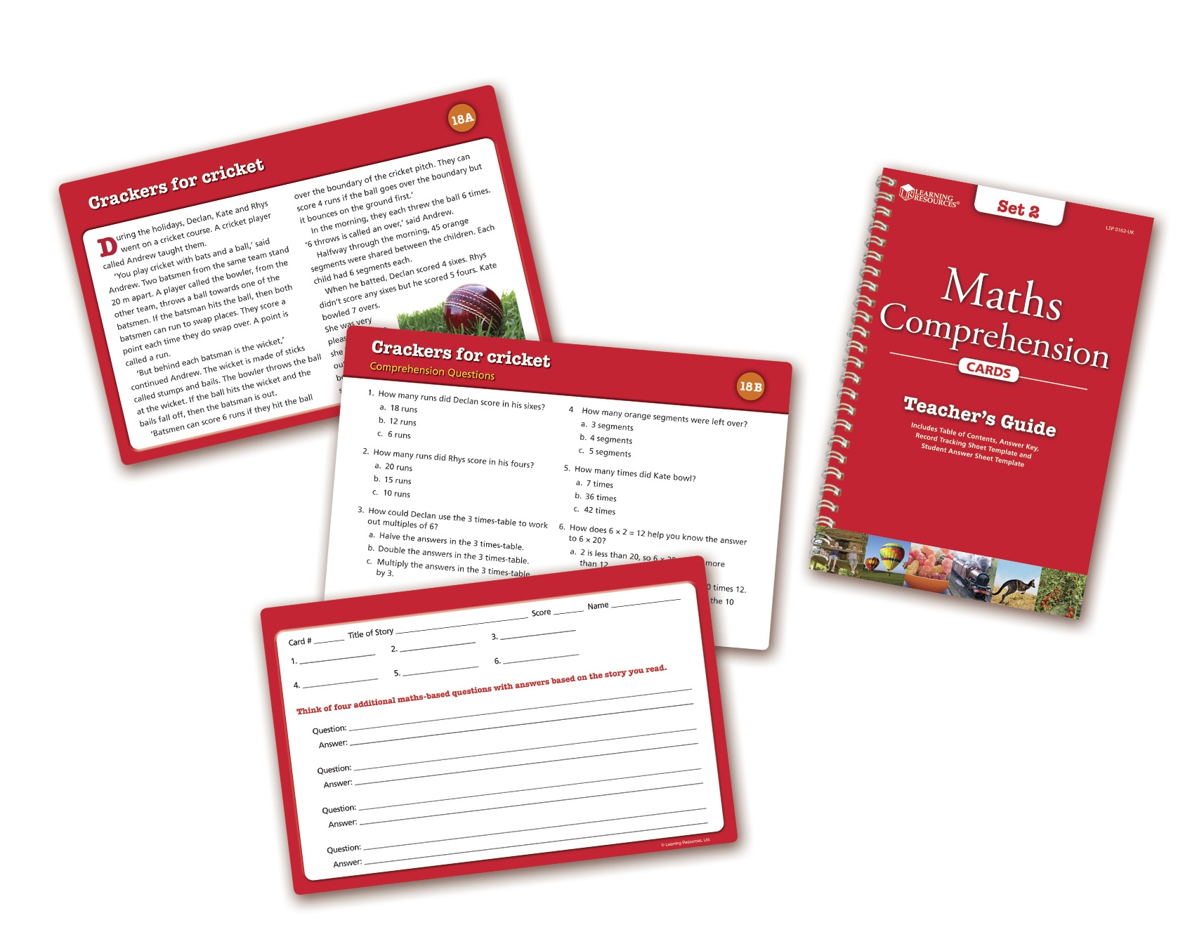 Students read the story on the front of the card before flipping over and answering six multiple-choice comprehension questions. The passages increase in difficulty within the set. This specific cards set (60 double-sided and colour-coded by topic) has been specifically written for year group four maths students (i.e. school year 4 to 7).