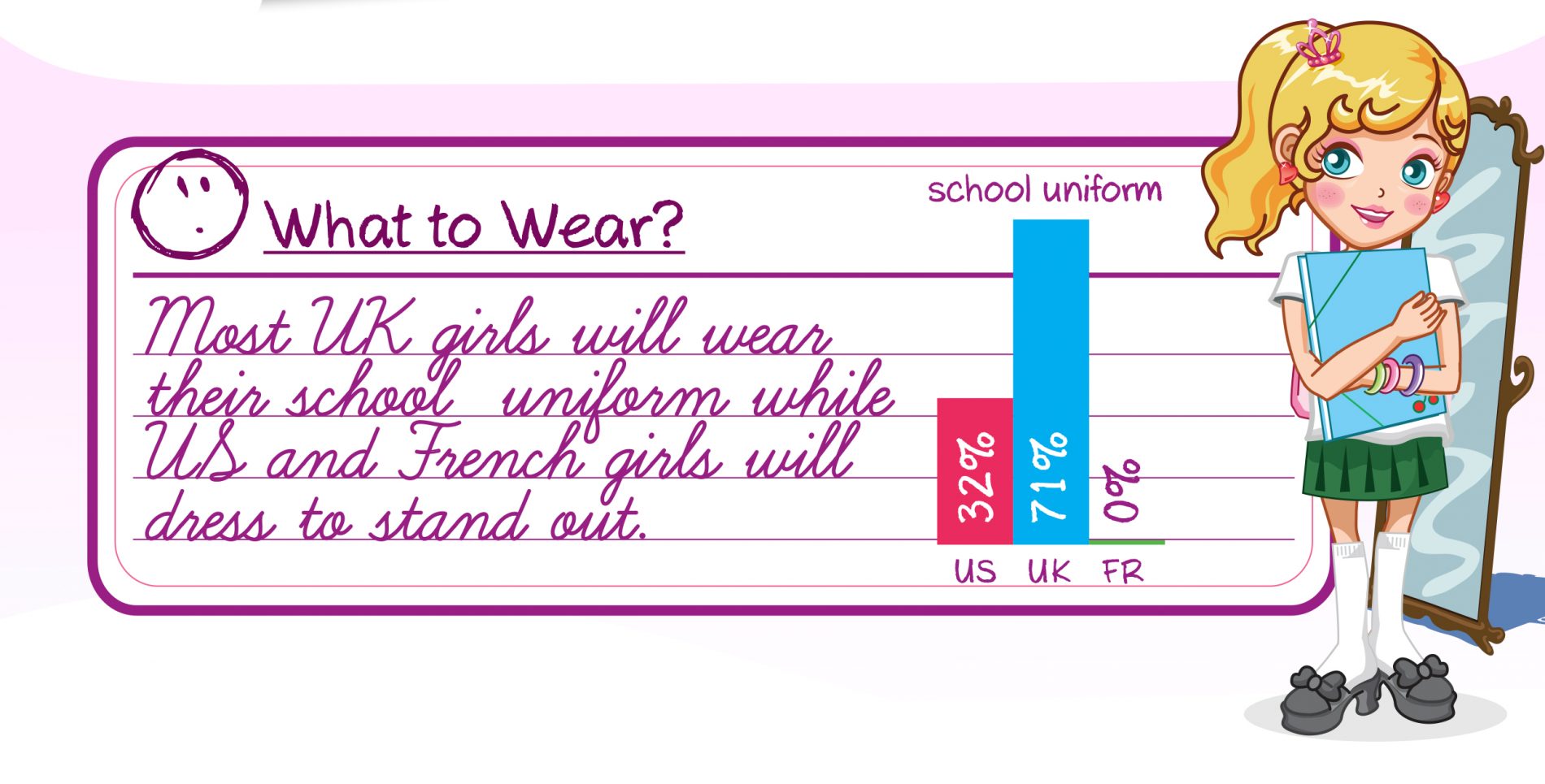 When it comes to style and attitude, almost half the US girls plan to dress to stand out from the rest of their classmates. This differs to girls in the UK who wear school uniforms and express their style through their school stuff, like their stationary and school bag (28%).