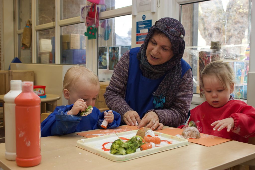 By the time children have reached the sophisticated age of three and four they are linking letters to words and print. They can create recognisable letters. Their movements are refined and able to rotate clockwise and anti-clockwise. They have finessed the tripod grasp where they can hold the pen between the thumb and the index and middle fingers. They are writing for purpose – making lists, writing letters to their friends just like the Jolly Postman. Children’s writing will often reflect the richness of the conversations they have in the nursery and at home. Everyone needs something to write about or someone to copy.