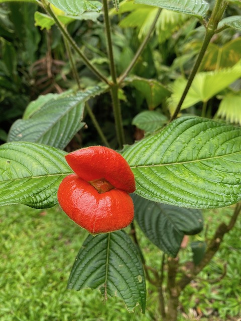 Affectionately, Psychotria elata is called Hooker’s Lips or the Hot Lips Plants. The plant has apparently evolved into its current shape to attract pollinators including hummingbirds and butterflies. The bracts are only kissable for a short while, before they spread open to reveal the plant’s flowers.