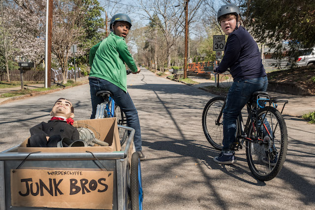 Sonny (Jeremy Ray Taylor, right) and Sam (Caleel Harris, left) finish loading their “Junk Bros” wagon with goods from the abandoned house in Columbia Pictures’ GOOSEBUMPS 2: HAUNTED HALLOWEEN.