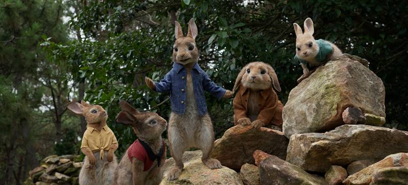 Flopsy (Margot Robbie), Mrs.Tiggy-Winkle (Sia), Peter Rabbit (James Corden) and Benjamin (Matt Lucas) in Columbia Pictures’ PETER RABBIT.