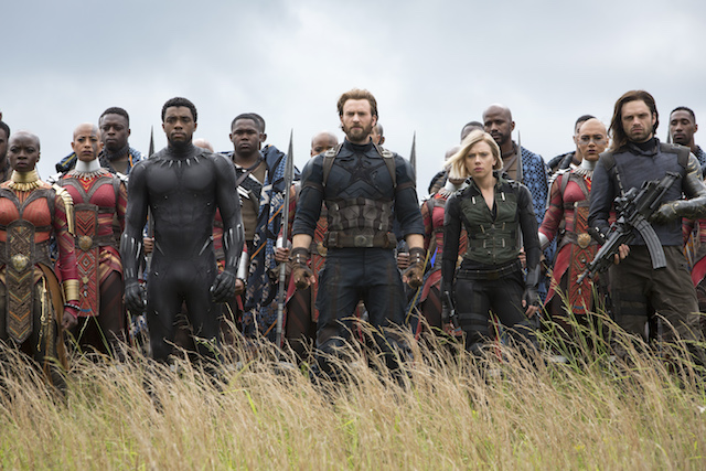 Marvel Studios’ AVENGERS: INFINITY WAR..L to R: Okoye (Danai Gurira), Black Panther/T’Challa (Chadwick Boseman), Captain America/Steve Rogers (Chris Evans), Black Widow/Natasha Romanoff (Scarlet Johansson) and Winter Soldier/Bucky Barnes (Sebastian Stan)..Photo: Chuck Zlotnick..©Marvel Studios 2018