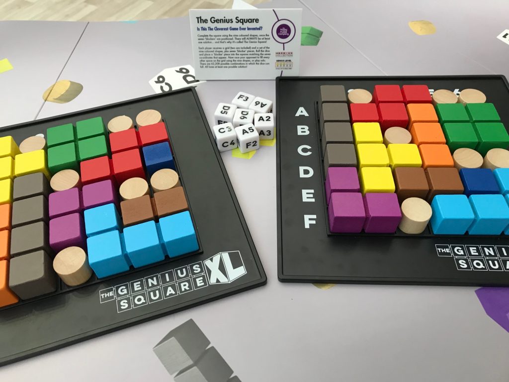 A competitive Tetris-like challenge for two players, The Genius Square requires you to fit the Tetris pieces together around 7 blocked out squares, defined by the dice coordinates. The genius thing is that any combination of the dice produce a pattern of empty squares which is fill-able with the Tetris pieces. Even I got to the end and felt quite pleased with myself. The winner completes the puzzle first.