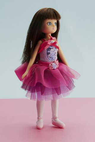 Lottie is based on a childlike body. She is slightly smaller than other fashion dolls as she is 7” in height (as opposed to 11.5”); she therefore fits easily into school bags, very easy to carry around, especially in her themed doll box with handle. Our dolls are very collectible in that they are finished with a high quality and attention to detail; a lot of the clothing uses tactile fabrics, are lined, have beautiful ribbons and bright buttons, attention to detail that girls pick up on. She has Saran nylon hair which is a premium hair from Japan that does not tangle as much.