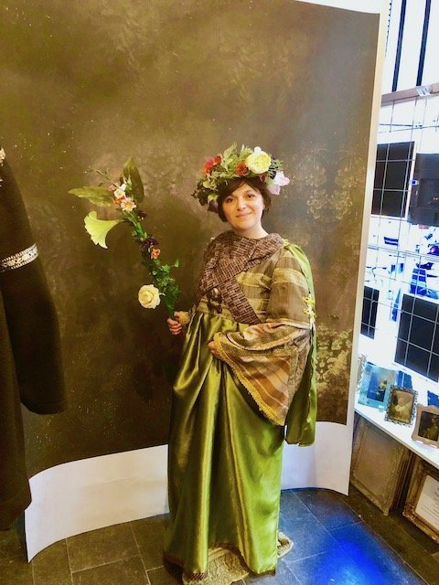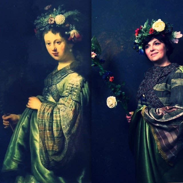 I chose to wear the Flora costume, although I was tempted to pose as the Girl with the Pear Earring. My Mediterranean complexion and my dark hair would have made me look a bit too pale with the yellow and blue costume. Check out if you like the final result.