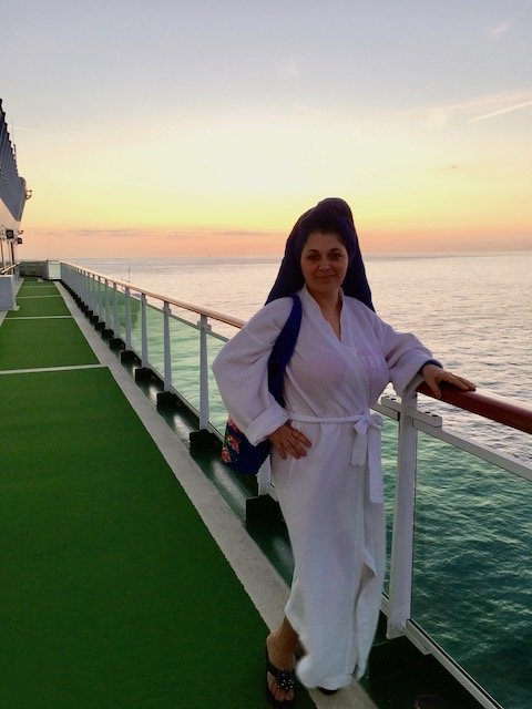 I always imagined very tiny cabins but this one had twin beds and was quite spacious for a ship accommodation. Maria and I made the most of everything available starting from the photo shoot in navy outfits as soon as we boarded to exclusive Oriental-themed dinners, spa treatments and disco nights.