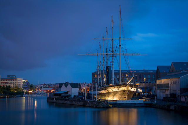 Twilight over Brunel’s SS Great Britain – worlds first steam-powered passenger liner, now a museum in dry dock, Bristol, England. Image shot 2014. Exact date unknown.
