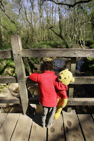 A young boy holding a Winnie the Pooh looks over Pooh Bridge in the Ashdown Forest.