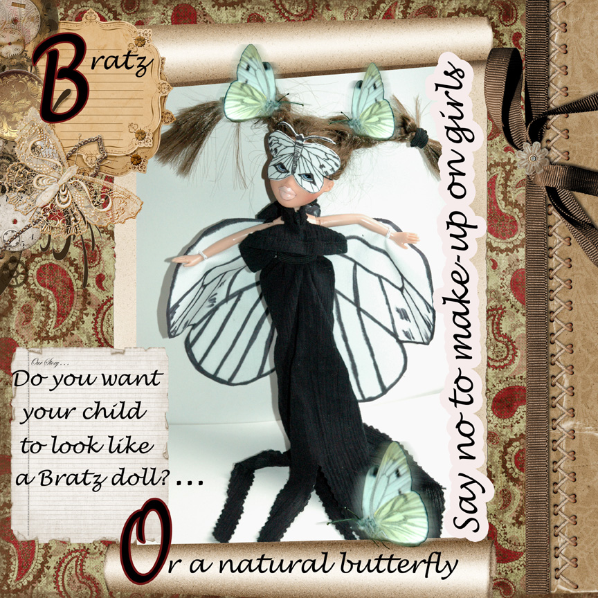 Saturday morning I was playing around with one of my little girl’s Bratz Dolls. I had read Monica’s write-up about Tanith Carey’s book “Where has my little girl gone?” And I felt a sense of relief that a Mother had published such a powerful message to give hope for change for our little girls future. The Bratz doll was mentioned and I felt it was time to change this doll into a Butterfly.