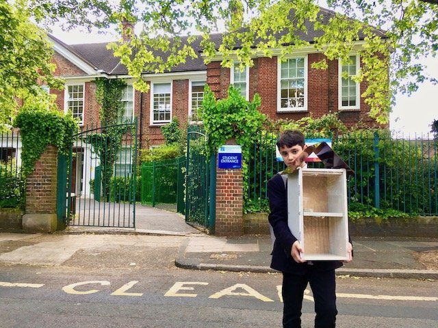 The day Diego finished our mini free library, I picked him up from school with the car and took this picture.