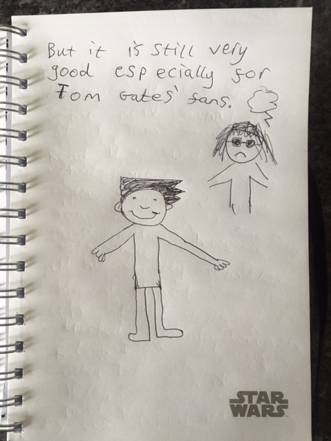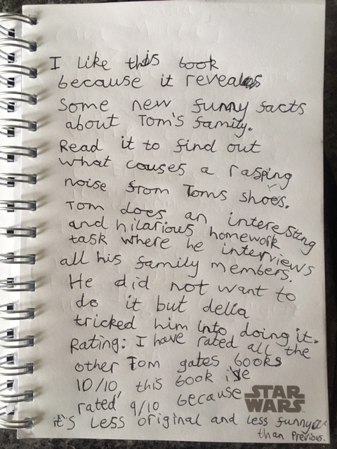 While preparing for the SATs exams, in the evening I relaxed with Liz Pichon’s latest book Tom Gates – Family, Friends and Furry Creatures. As with all other Tom Gates’ books, I have truly enjoyed myself once again and here is why. I hope you can understand my ‘hen-writing’. 🙂