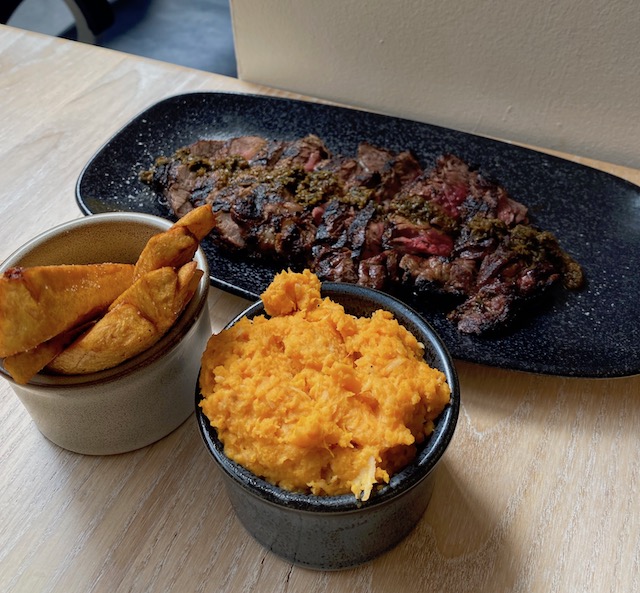 Rum marinated Ribeye, boniato mash, salsa verde (£29): juicy steak with sweet potato mash and horseradish (boniato).