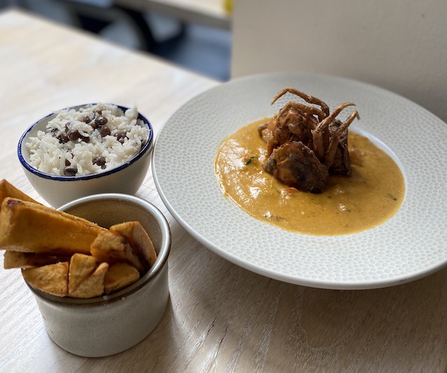 Crab claw curry, soft shell crab, rice & peas (£25): Delicate coconut sauce in the curry. Even the crab’s legs are edible and crunchy.